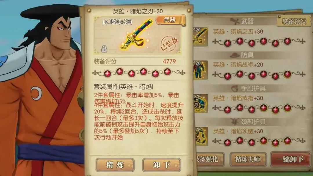 装备方面觉醒御田因为要打坚韧伤害,而且他有面板转换的暴击爆伤,所以优选自然是有共鸣的暗焰套,次之则是狂猎套,不过狂猎套没有套装破韧效果,因此如果没有共鸣的话就首选暗焰,次选统治者。