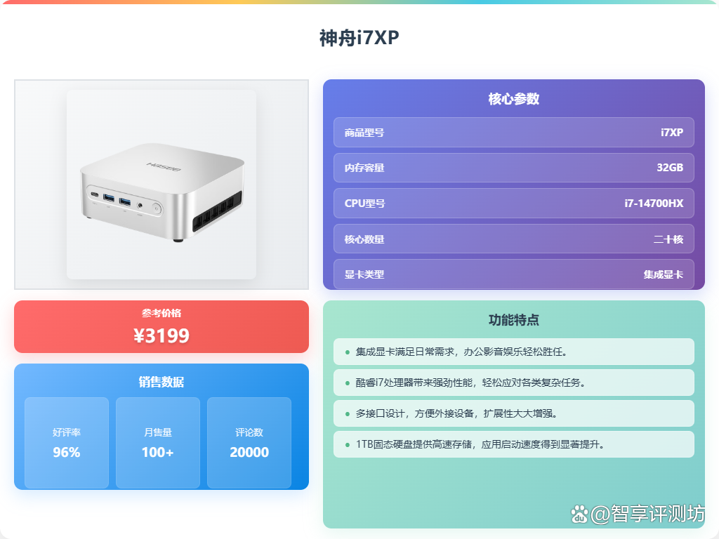 这款神舟迷你PC,核心动力在于它搭载的 i7-14700HX处理器,20核28线程的设计,无论是大型游戏还是专业软件,都能hold住。 32GB内存 加上 1TB SSD,多任务处理不在话下,告别卡顿,效率嗖嗖嗖地提升!