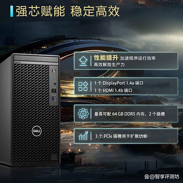 接口方面,OptiPlex 7020配备了USB Type-C、DisplayPort和HDMI等多种端口,连接各种设备都很方便。无线连接上,它至高可选英特尔Wi-Fi 7网卡,网速嗖嗖的。更棒的是,它还应用了ExpressResponse技术,能够分析应用并提升性能,音视频方面也做了增强,整体体验很棒。
