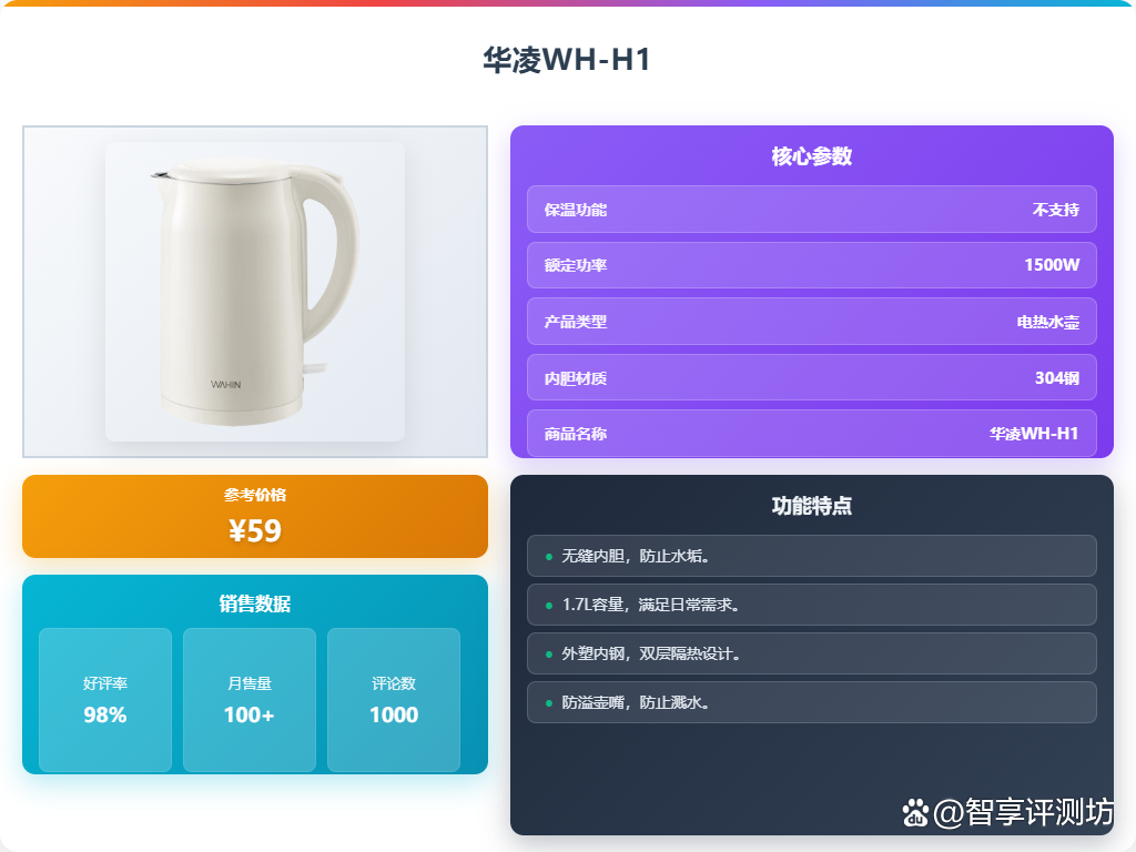 华凌这款电热水壶,我得说说,1500W大功率,烧水那叫一个快!1.7L的容量也够用了,日常家用妥妥的。而且304不锈钢内胆,用起来放心,没有异味,健康这块拿捏得死死的。