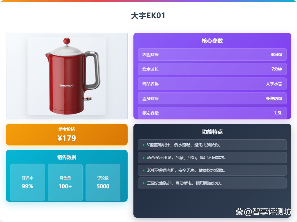 安全方面也考虑得很周到,双层隔热设计,不用担心烫手。而且还有三重安全防护,像防干烧、高温熔断这些都有,用起来更放心。再加上材质用的是304不锈钢,安全防腐蚀,用着也安心。