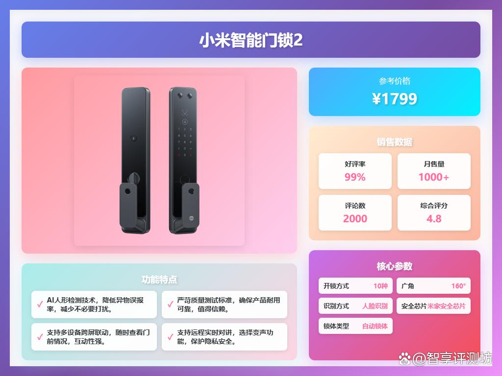 当然,解锁方式也足够丰富,除了人脸识别,还有指纹、密码、NFC等多种选择。听说它还能和米家其他智能设备联动,比如开门自动开灯、关窗帘,想想就觉得生活品质都提升了不少!而且它还具备多重安全防护,以及远程管理和告警功能,有了它,家里的安全系数都感觉提升了一个档次!