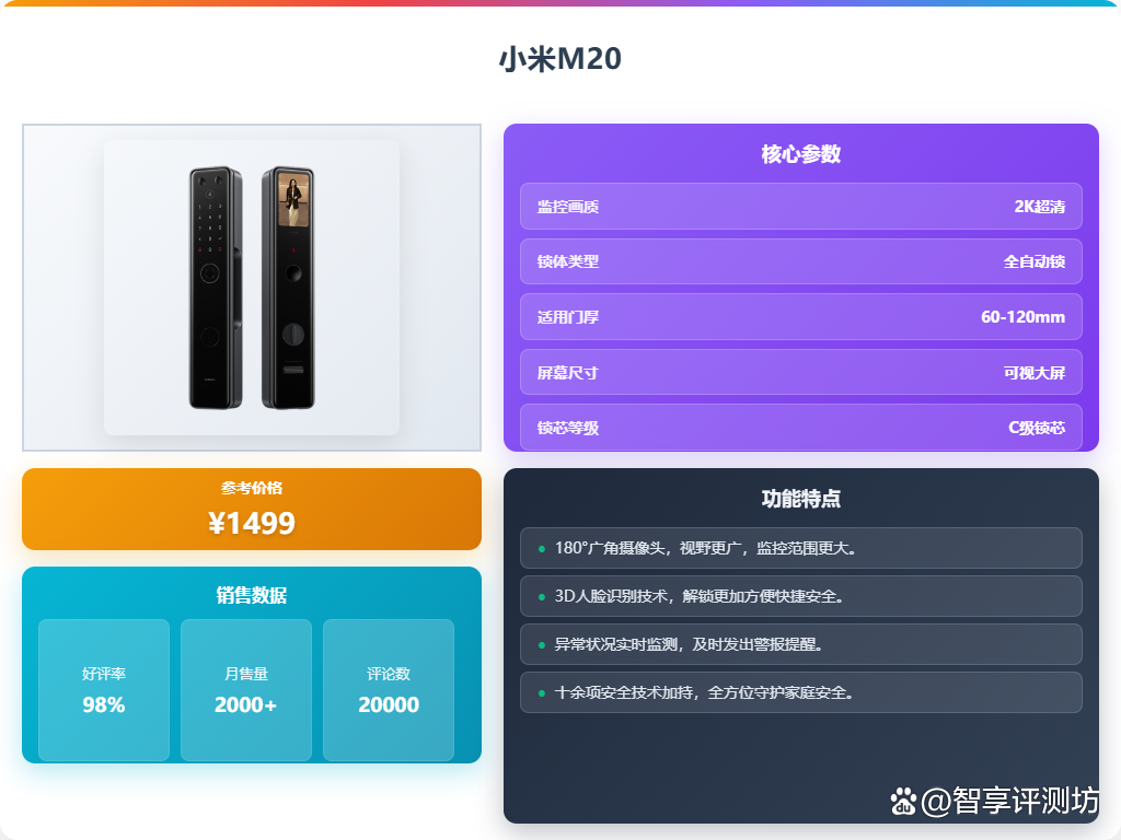 小米M20电子锁评测来啦!这款锁采用全自动锁体,关门即锁,再也不用担心忘带钥匙或者忘记锁门啦。多种开锁方式也很方便,指纹、密码、NFC等,想用哪个用哪个,家里老人小孩也能轻松上手。而且它还能接入米家,实现智能联动,开门自动开灯,想想都觉得方便。