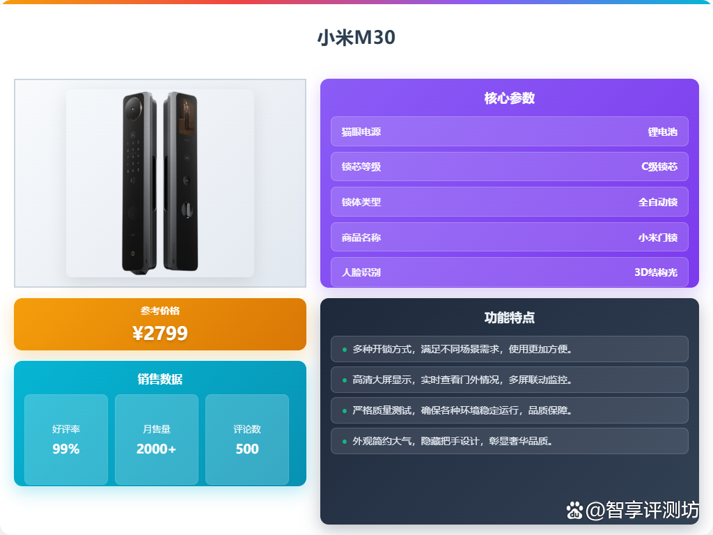 体验了小米智能门锁M30,感觉它在开锁方式上真是下了功夫!人脸识别、指纹、密码、NFC啥都有,甚至还能用小米手环开锁,这便利性没得说。而且它还带AI猫眼,能识别快递包裹和儿童出门,感觉安全感直接拉满!