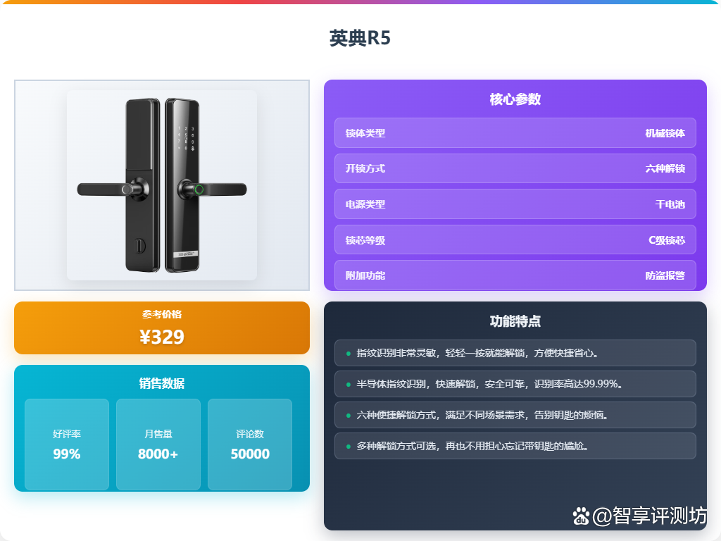 这款英典R5电子锁,解锁方式那是相当丰富!指纹、密码、小程序、感应卡、钥匙,甚至还有临时密码,足足六种方式可选。特别是那个FPC半导体指纹识别,听说又快又准,识别率高达99.99%,这速度,嗖一下就开门了,再也不用担心手指出汗识别不出来了。